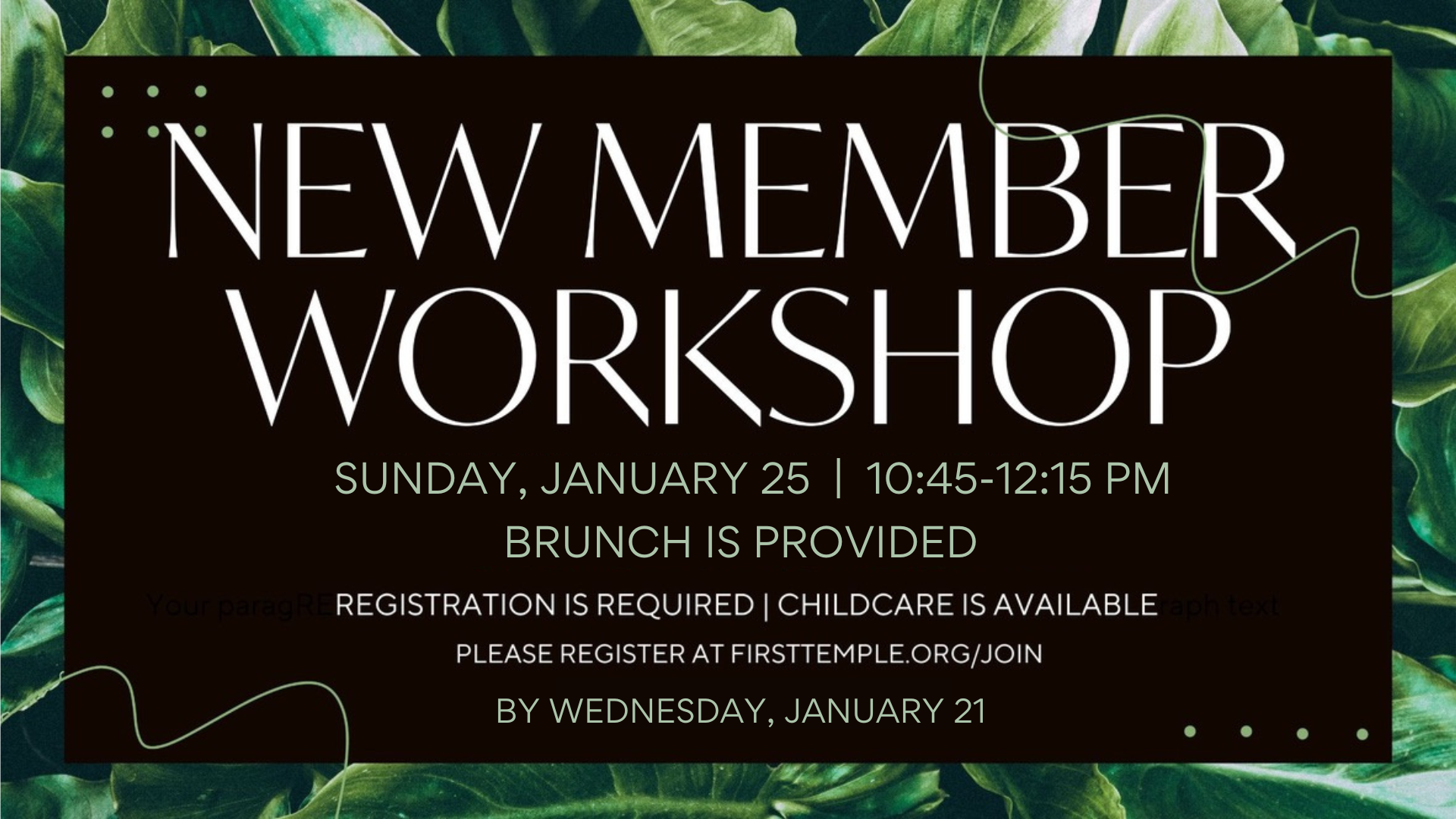 Our New Member Workshop is an opportunity to learn more about First Temple – including our beliefs, ways to get involved, how to become a member, and a time to meet our staff and ask questions. The next NMW is January 25th at 10:45 AM to 12:15 PM. Brunch will be included and childcare is available. If you would like to attend, please register by Wednesday, January 21st, 2025.